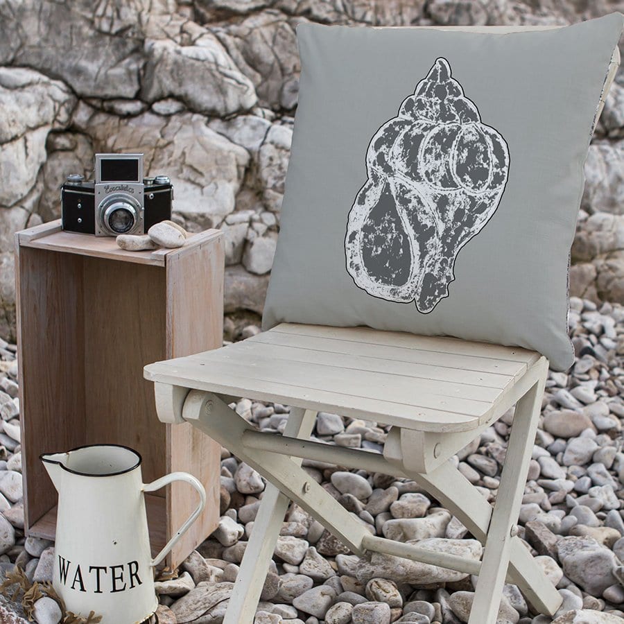 Whelk shell on grey outdoor cushion