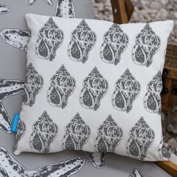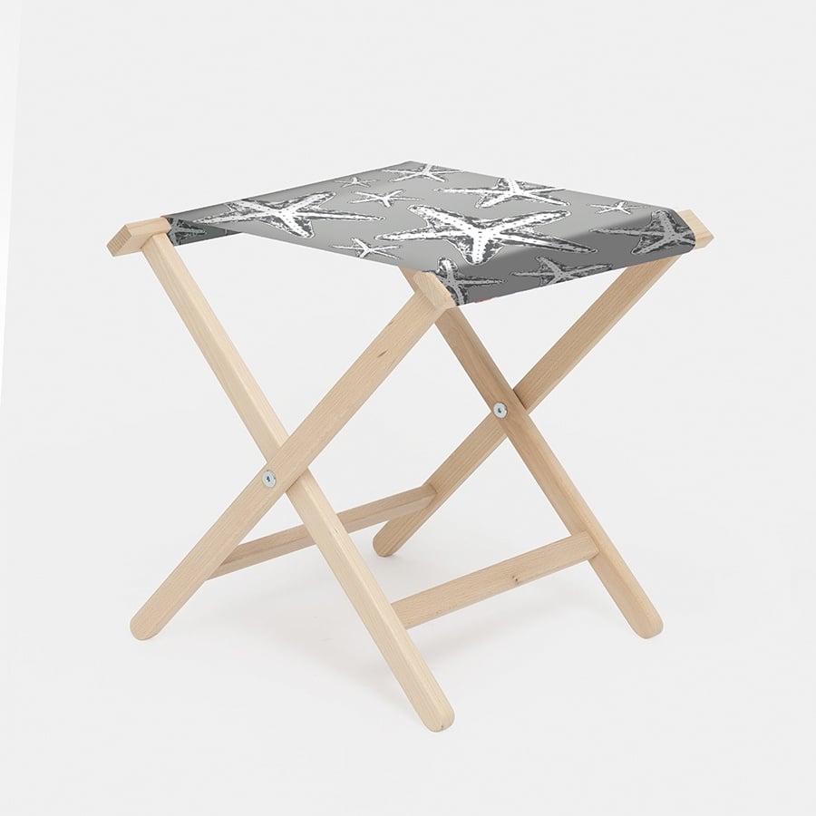 The starfish outdoor stool has grey and white scallop shell prints on a grey background.